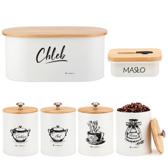 Pojemniki kuchenne zostały zaprojektowane tak, aby spełniać wszystkie potrzeby Twojej kuchni. Są odporne na uszkodzenia mechaniczne oraz łatwe do utrzymania w czystości. Wykonane z metalu malowanego proszkowo na kolor biały. Pokrywy wykonane z drewna bambusowego. W pokrywie maselniczki nożyk do smarowania umieszczony w wyprofilowanym zagłębieniu.