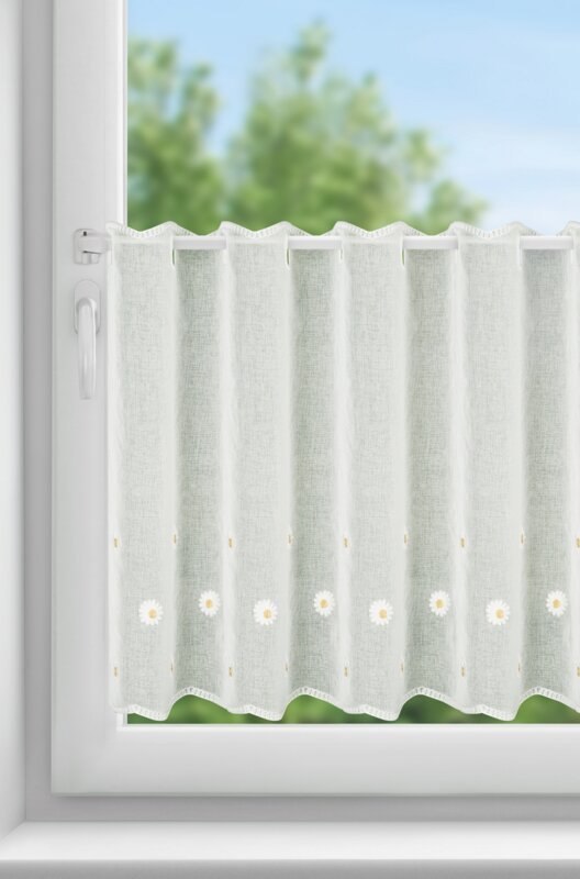 Zazdrostka gotowa z haftem w stokrotki szerokość: 150 cm, długość: 70 cm, kolor: biały, Gramatura: 70 GSM, Skład: 100% poliester