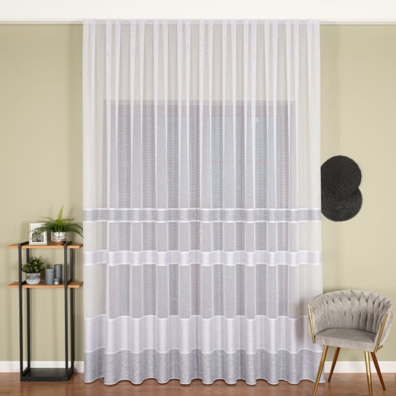 Firanka fantazyjna 001827 wykonana z poliestru jest trwała i odporna na odkształcenia. Materiał zachowuje biały kolor i jasnoszare pasy nawet po wielu praniach, szybko schnie i nie wymaga prasowania. Dzięki zastosowaniu ołowianki tkanina układa się elegancko na karniszu, tworząc efektowne fale.