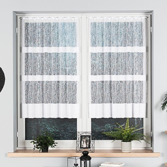 Subtelny wzór żakardowy i uniwersalny biały kolor sprawiają, że firana pasuje do każdego wnętrza, wprowadzając do niego świeżość i elegancję. Materiał jest łatwy w utrzymaniu – można go prać w pralce, a dzięki właściwościom poliestru firana nie wymaga prasowania. Po zawieszeniu układa się w naturalne fałdy, prezentując estetyczny wygląd przez długi czas.