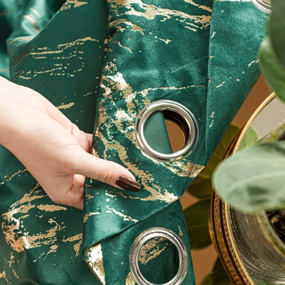 MARMA Zasłona gotowa na przelotkach, szerokość 140cm x wysokość 250cm, kolor 010 ciemny zielony; butelkowy ze złotym nadrukiem n