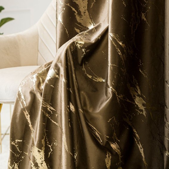 MARMA Zasłona gotowa na taśmie, szerokość 140cm x wysokość 250cm, kolor 002 brązowy ze złotym nadrukiem na VELVI TD0033/ZGT/002/