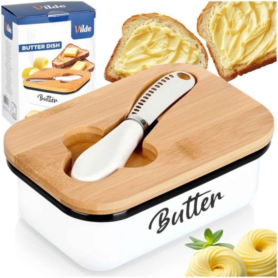 Przydatna maselniczka w zestawie z nożykiem, która sprawdzi się do przechowywania oraz serwowania masła. Posiada praktyczne przykrycie. Wykonana z materiałów bezpiecznych dla zdrowia i neutralnych dla żywności. Klasyczny wzór sprawi, że będzie pięknie prezentować się z każdą zastawą stołową. Przydatna w każdym domu. Oryginalny produkt marki Vilde. Wyprodukowano zgodnie z europejskimi standardami.