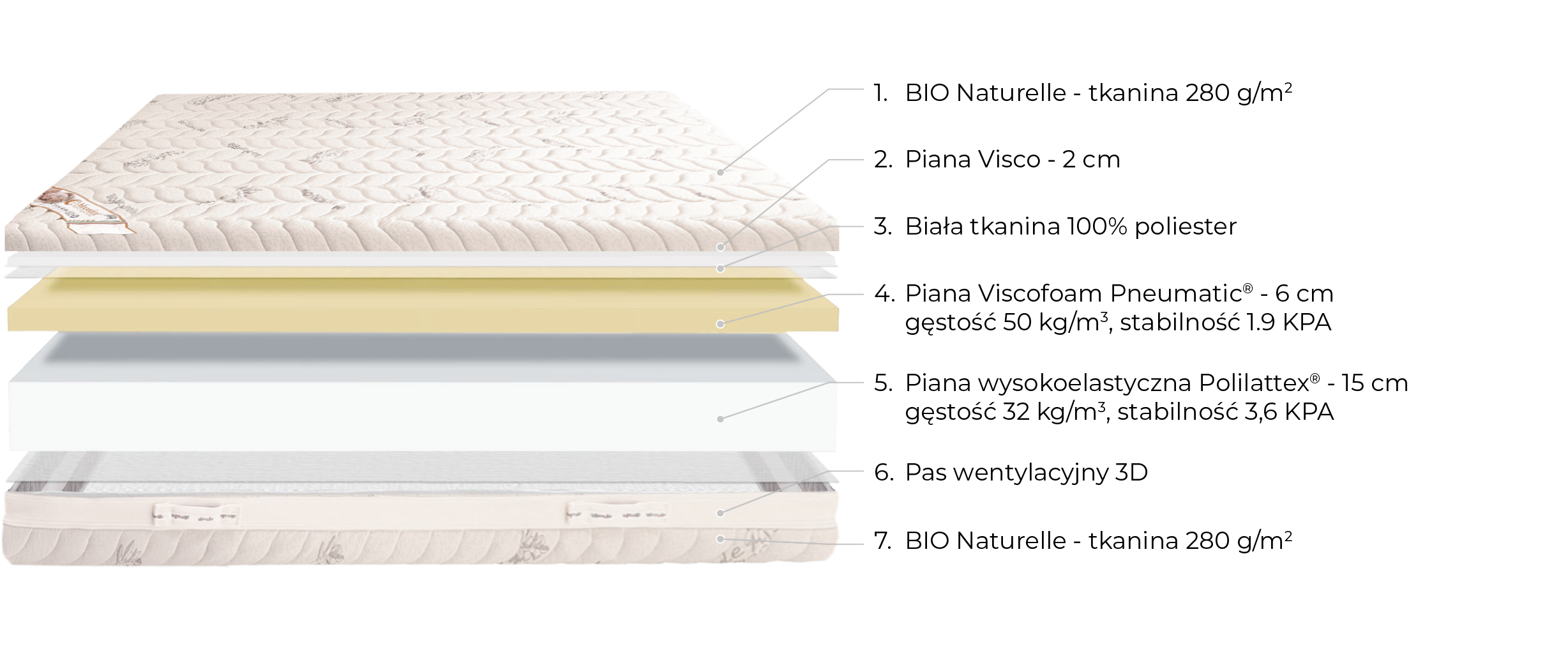 Modele materacy: Bellagio, Optima Fresh, Double Confort, Tirso, Allegro Soft, Garda, Allegro Fresh, Aleo Verde, Sano, Splendid Comfort, Modena, Nuvola Lusso, Diverso, Silver Spring, Argento Therapy, Novia, Moreno, Visco Shape, Fabiola, Giulietta, Livia, Zoe, Elia, Flavia, Sofia, Bordato, Dane, Luna, San Remo Classic, Silver Fresh, Marrone, Bianco, Superior, Doppio, Avelso, El Molly, Dea Multi, Lagri, Rubio, Firmino Duo.