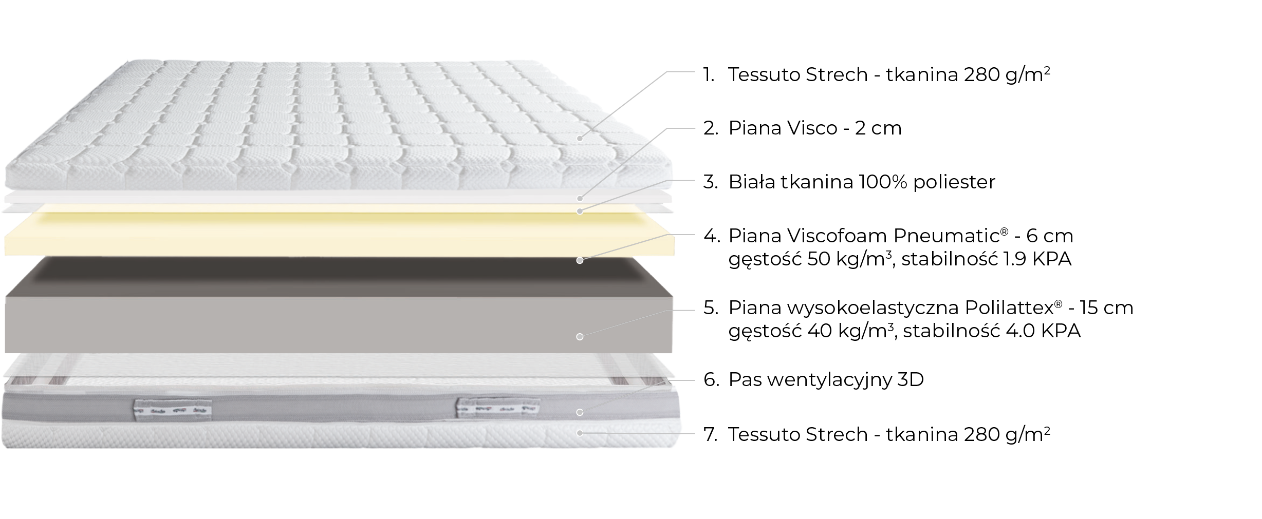 Wypełnienie pokrowca tworzy pianka Visco o grubości 2 cm, która reaguje zarówno na ciepło, jak i nacisk ciała. Dzięki temu materac zapewnia uczucie przyjemnego otulenia oraz idealne dopasowanie do sylwetki. Pianka Visco skutecznie redukuje punkty nacisku, wspiera regenerację organizmu i poprawia komfort snu, czyniąc materac Novia doskonałym wyborem dla osób ceniących zdrowy i relaksujący wypoczynek.