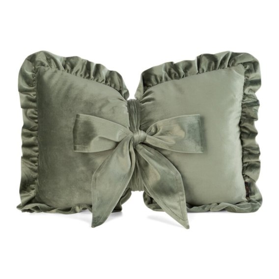 Welwetowa poduszka z wypełnieniem w kształcie kokardy, obszyta falbaną szerokość: 35 cm, długość: 55 cm, kolor: oliwkowy, Gramatura: 200 GSM, Skład: 100% poliester