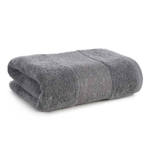 Ręcznik bawełniany z bordiurą zdobioną błyszczącą nicią szerokość: 70 cm, długość: 140 cm, kolor: stalowy, Gramatura: 500 GSM, Skład: 100% bawełna; część ozdobna: 50% bawełna, 50% poliester