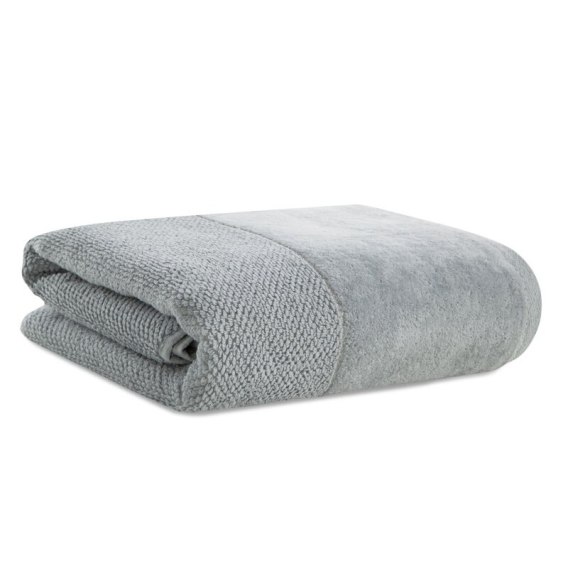 Ręcznik bawełniany z welurową bordiurą i błyszczącą nicią szerokość: 30 cm, długość: 50 cm, kolor: srebrny, Gramatura: 550 GSM, Skład: 100% bawełna; część ozdobna: 97% bawełna, 3% poliester