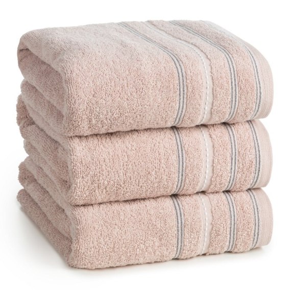 Miękki, klasyczny ręcznik kąpielowy z chłonnej tkaniny bawełnianej frotte zdobiony subtelną, elegancką bordiurą. Jednokolorowy ręcznik nie farbuje. szerokość: 50 cm, długość: 90 cm, kolor: pudrowy, Gramatura: 500 GSM, Skład: 100% bawełna; część ozdobna: 96% bawełna, 4% poliester
