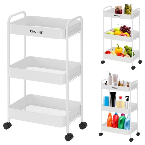 Elegancki, praktyczny i niezwykle funkcjonalny — trzypoziomowy regał mobilny KINGHoff to doskonałe rozwiązanie do kuchni, łazienki, salonu lub biura. Dzięki solidnej stalowej konstrukcji i nowoczesnemu białemu wykończeniu idealnie wpasuje się w każde wnętrze, zapewniając wygodne miejsce do przechowywania i łatwy dostęp do niezbędnych przedmiotów.