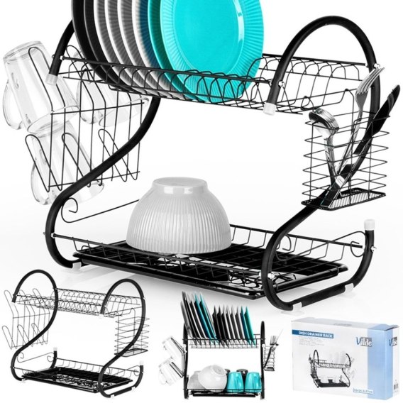 Kompaktowa, dwupoziomowa suszarka do naczyń w kolorze czarnym. Posiada miejsce na talerze, szklanki, kubki, ociekacz na sztućce oraz uchwyt na deskę do krojenia. Wyposażona w tacę ociekową.