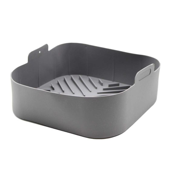 Wielorazowy wkład do frytkownicy Air Fryer. Wykonany z silikonu w kolorze szarym. Użyty silikon jest nieprzywierający. Odporny na wysokie temperatury.