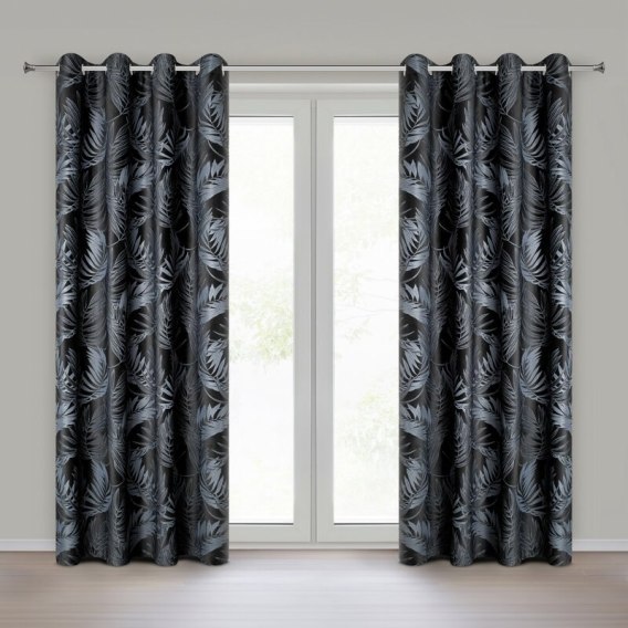 Zasłona gotowa welwetowa z motywem liści szerokość: 140 cm, długość: 250 cm, kolor: czarny, Gramatura: 200 GSM, Skład: 100% poliester