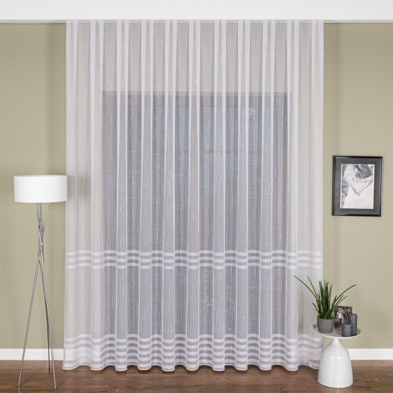 Biała firanka z białą nitką i ołowianką łączy klasyczną elegancję z delikatnym, nowoczesnym akcentem. Jej fantazyjny wzór wprowadza do wnętrza lekkość i elegancki charakter. Dzięki uniwersalnej kolorystyce firanka 001888 pasuje zarówno do klasycznych, jak i nowoczesnych aranżacji.