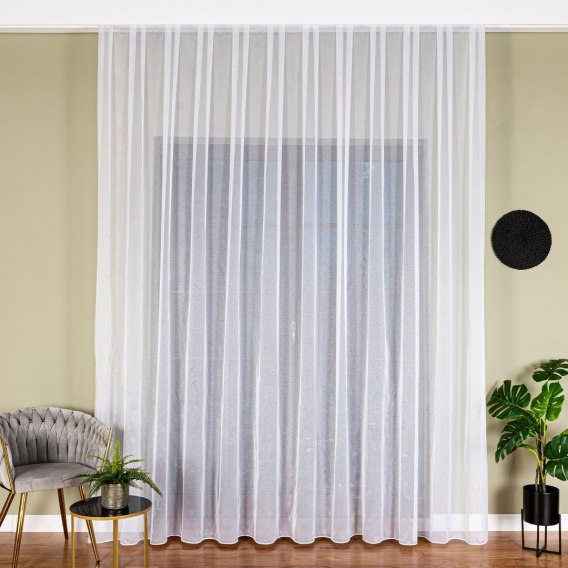 Firanka fantazyjna 423084 wykonana z poliestru jest trwała i odporna na odkształcenia. Materiał zachowuje biały kolor nawet po wielu praniach i szybko schnie po praniu. Dzięki zastosowaniu ołowianki tkanina układa się elegancko na karniszu, tworząc efektowne fale.