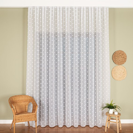 Firanka fantazyjna 424092 wykonana z poliestru jest trwała i odporna na odkształcenia. Materiał zachowuje biały kolor nawet po wielu praniach i szybko schnie po praniu. Dzięki zastosowaniu ołowianki tkanina układa się elegancko na karniszu, tworząc efektowne fale.