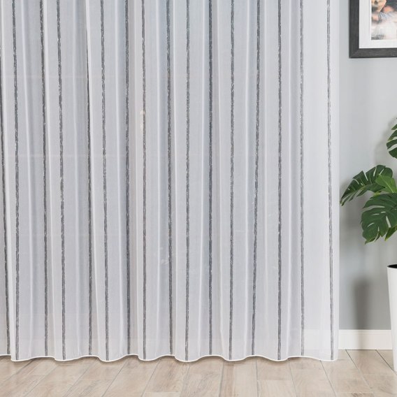 Firanka fantazyjna ze wzorem pasowym z ołowianką, wysokość 305cm, kolor 007 biały z czarnym ze srebrną nitką 019789/OLO/007/0003