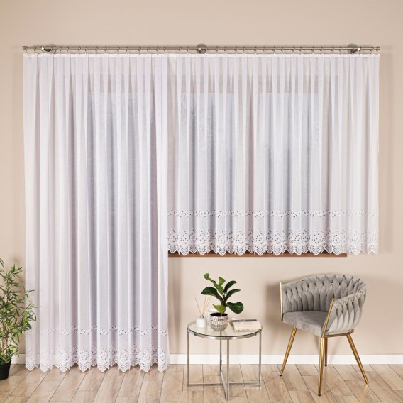 Firanka wykonana jest w 100% z poliestru, co gwarantuje trwałość, odporność na zagniecenia oraz łatwość w pielęgnacji. Materiał dobrze przepuszcza światło dzienne, tworząc przyjemną i jasną atmosferę w salonie, sypialni lub jadalni, jednocześnie zapewniając prywatność domowników. Gotowa forma firanki umożliwia szybki i wygodny montaż, dzięki czemu natychmiast odmienia wygląd okna.