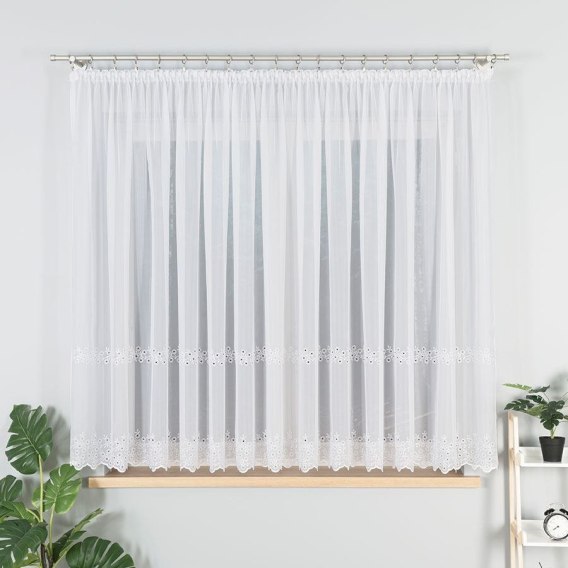 Biała firanka haftowana 112746 pasuje do wnętrz klasycznych, nowoczesnych i skandynawskich. Delikatny haft nadaje elegancji i lekkości, a sprzedaż na metry pozwala idealnie dopasować szerokość firanki do każdego okna.