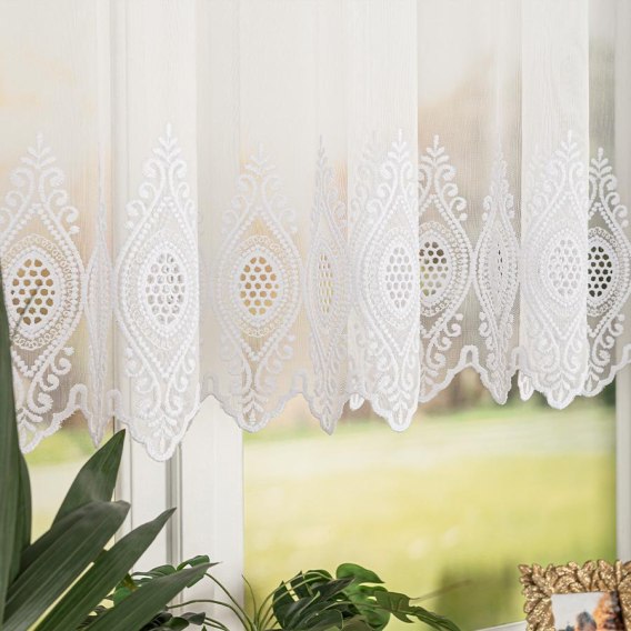 Dzięki sprzedaży na metry firankę można idealnie dopasować do szerokości każdego okna, tworząc spójną i stylową aranżację. Firanka haftowana 123995 jest idealnym rozwiązaniem do mniejszych i średnich okien, dodając wnętrzu elegancji i subtelnego charakteru.