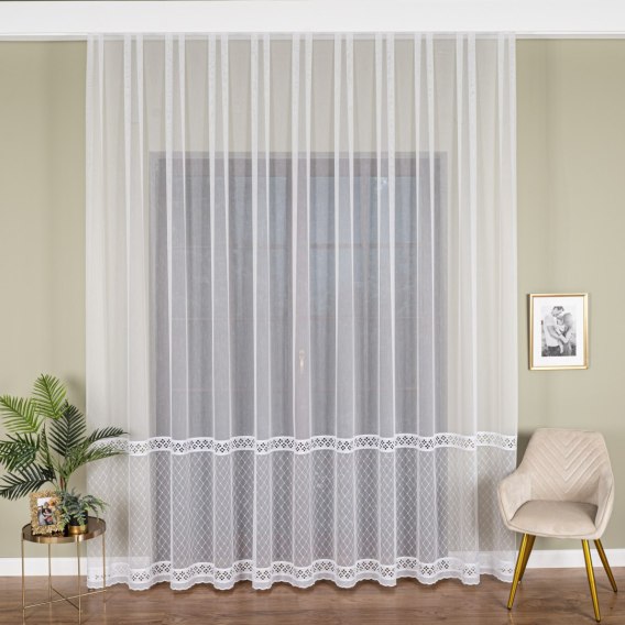Firanka haftowana na metry FH0019 została wykonana z lekkiego i wytrzymałego poliestru, który nie odkształca się i zachowuje estetyczny wygląd przez długi czas. Materiał jest odporny na działanie promieni słonecznych, dzięki czemu firanka długo utrzymuje śnieżnobiały kolor.