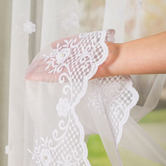 Firanka haftowana na metry FH0021 została wykonana z lekkiego, wytrzymałego poliestru, który nie odkształca się i zachowuje estetyczny wygląd przez długi czas. Materiał jest odporny na działanie promieni słonecznych, dzięki czemu firanka długo utrzymuje śnieżnobiały kolor.