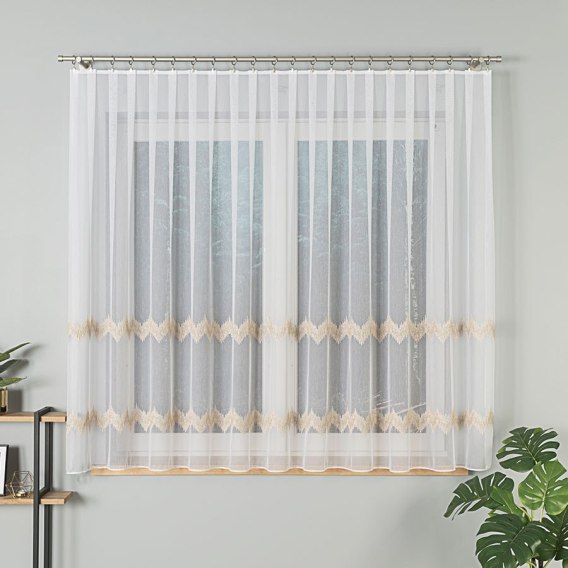 Biała firanka haftowana 112750 ze złotymi detalami doskonale komponuje się z wnętrzami klasycznymi, nowoczesnymi i glamour. Wykończenie ołowianką zapewnia eleganckie układanie tkaniny, a sprzedaż na metry pozwala dopasować szerokość firanki do każdego okna, tworząc spójną aranżację wnętrza.