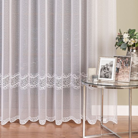Firanka z aplikacją ze wzorem pasowym na markizecie, wysokość 280cm, kolor 001 biały 034617/433/001/000280/1