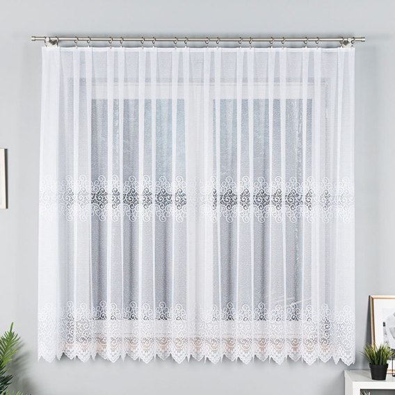 Model 001539 charakteryzuje się delikatnym żakardowym motywem, który pięknie układa się na tkaninie, tworząc elegancki i ponadczasowy efekt. Biały kolor dodaje lekkości i rozświetla pomieszczenie, sprawiając, że nawet mniejsze wnętrza stają się bardziej przestronne. Regularny raport wzoru (8,5 cm) nadaje firanie rytmiczności i harmonii, dzięki czemu świetnie prezentuje się zarówno w nowoczesnych, jak i tradycyjnych aranżacjach. To idealny wybór dla osób, które cenią estetykę, minimalizm i klasyczne piękno w wystroju wnętrz.
