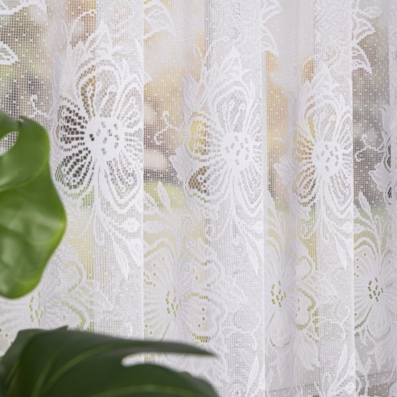 Firanka została wykonana z wysokiej jakości 100% poliestru, co zapewnia trwałość, odporność na zagniecenia oraz łatwość w pielęgnacji. Materiał nie wymaga prasowania i długo zachowuje estetyczny wygląd. Firanka 004713 łączy elegancję z funkcjonalnością.