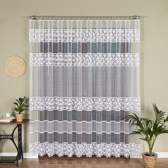 Firanka została wykonana z wysokiej jakości 100% poliestru, co zapewnia jej trwałość, odporność na zagniecenia oraz łatwą pielęgnację. Tkanina żakardowa zachowuje estetyczny wygląd przez długi czas, nie wymaga prasowania i świetnie sprawdza się w codziennym użytkowaniu. Firanka 017563 łączy klasyczny styl z praktycznym zastosowaniem.