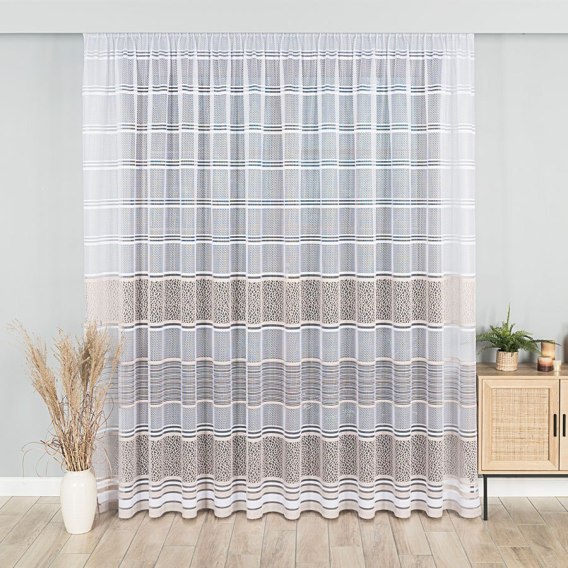 Firanka 017834 prezentuje się doskonale zarówno jako samodzielna dekoracja, jak i w zestawieniu z zasłonami lub roletami, tworząc harmonijną i stylową oprawę okna.