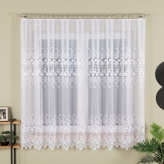 Firanka wykonana jest z wysokiej jakości 100% poliestru, co zapewnia trwałość, odporność na zagniecenia oraz łatwość w pielęgnacji. Materiał nie wymaga prasowania i długo zachowuje estetyczny wygląd. Firanka 018965 łączy funkcjonalność z eleganckim, klasycznym designem.