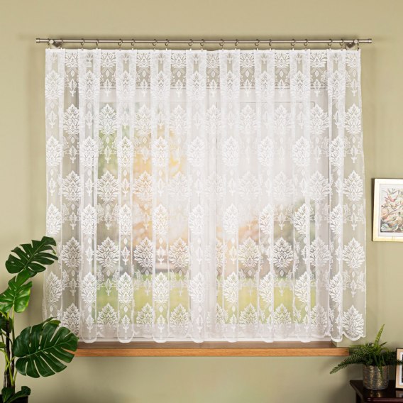 Biały kolor firanki jest uniwersalny i ponadczasowy, dzięki czemu doskonale komponuje się z wnętrzami w różnych stylach – od nowoczesnych, przez skandynawskie, po klasyczne. Delikatny wzór żakardowy nadaje elegancji i dekoracyjnego charakteru, nie ograniczając jednocześnie dostępu naturalnego światła.