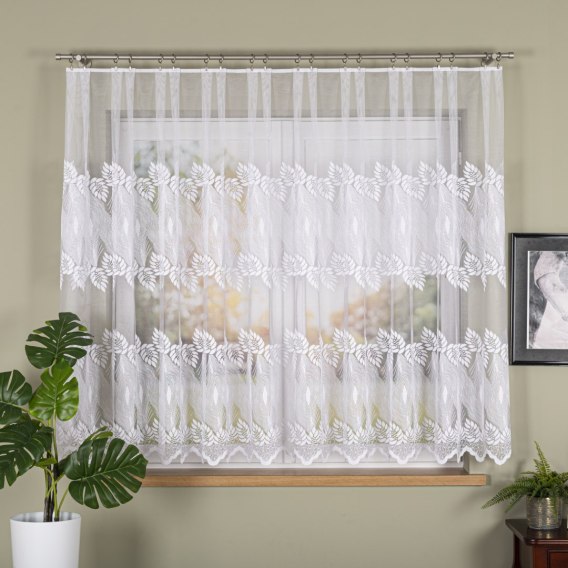 Firanka została wykonana z wysokiej jakości 100% poliestru, co gwarantuje trwałość, odporność na zagniecenia oraz łatwość w codziennej pielęgnacji. Materiał dobrze się układa, nie traci koloru i zachowuje estetyczny wygląd nawet po wielu praniach. Model 049365 to połączenie klasycznego stylu z funkcjonalnością.