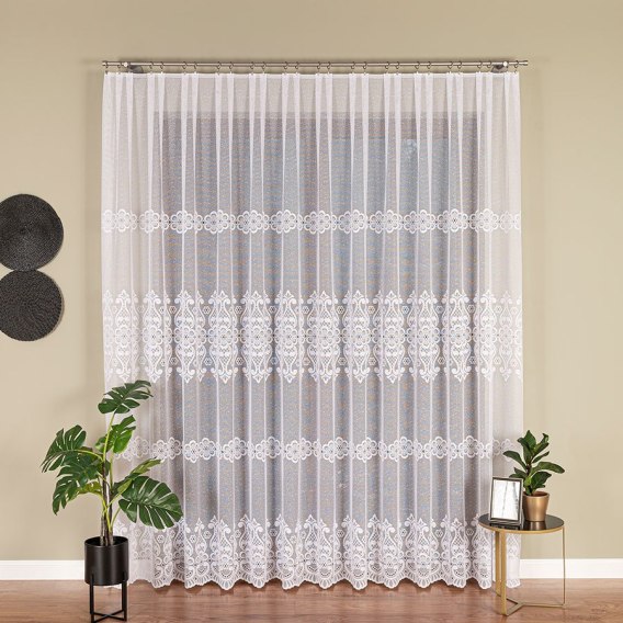 Firanka żakardowa 360940 wykonana jest z trwałego materiału odpornego na blaknięcie i działanie promieni słonecznych. Poliester to tkanina lekka, szybkoschnąca i łatwa w utrzymaniu czystości, dzięki czemu firanka zachowuje swój śnieżnobiały kolor przez wiele lat.