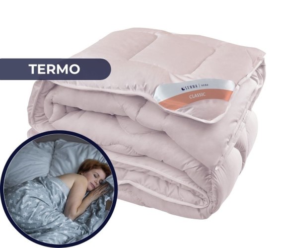 Zimowa kołdra Termo firmy INTER-WIDEX to dwie kołdry zszyte razem z komorą powietrzną między nimi, która znacznie podnosi walory cieplne kołdry. Jej wypełnienie stanowią włókna silikonowane, które są doskonałe dla alergików. Można ją prać w domu i prasować. Dostępna w kolorze różowym i kremowym i w rozmiarze 180x200 cm.