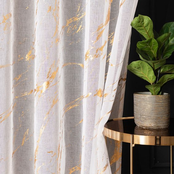 MARMA Firana gotowa na taśmie z ołowianką, szerokość 140cm x wysokość 250cm, kolor 001 biały ze złotym zdobieniem 132101/FGT/004