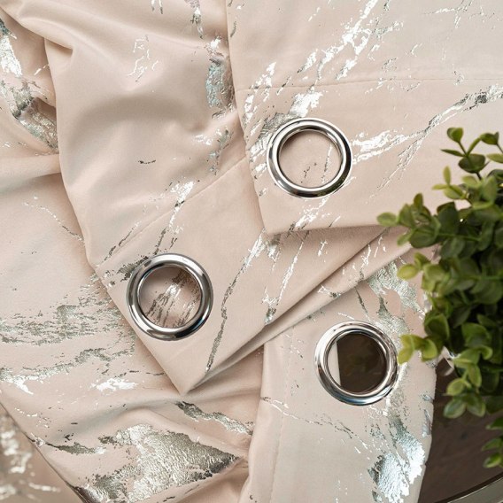 Wykonana z welwetowego materiału z dekoracyjnym jednostronnym srebrnym marmurowym nadrukiem to połączenie elegancji i nowoczesności. Zasłony MARMA dostępne są w dwunastu kolorach.