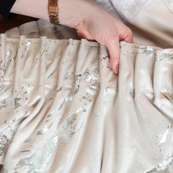 MARMA Zasłona gotowa na taśmie, szerokość 140cm x wysokość 250cm, kolor 226 jasny kremowy ze srebrnym nadrukiem na VELVI TD0037/