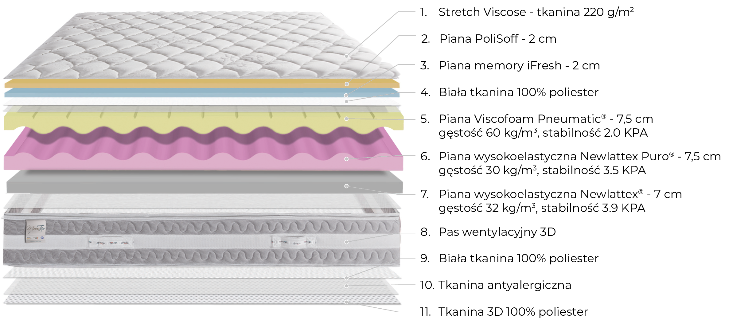 Warstwa wierzchnia pokrowca wzbogacona została o innowacyjną pianę wysokoelastyczną PoliSoff o otwartokomórkowej strukturze. Dzięki niej materac dopasowuje się do sylwetki i zapewnia uczucie miękkości oraz odprężenia. We wnętrzu znajduje się opatentowana piana Memory iFresh, która reaguje na temperaturę ciała, zapewniając idealny komfort termiczny i ograniczając przegrzewanie się podczas snu. Połączenie tych nowoczesnych pian sprawia, że materac Nuvola Lusso wyróżnia się doskonałą ergonomią i wyjątkową wygodą.
