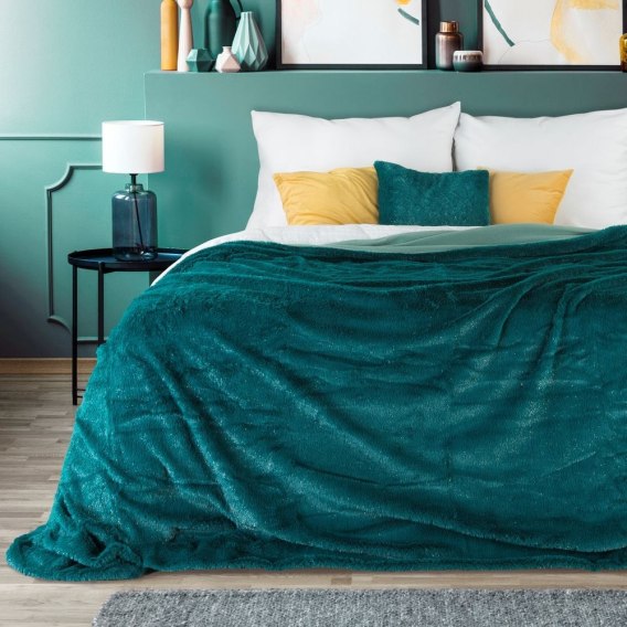 Jednokolorowa, przyjemna w dotyku narzuta z tkaniny o strukturze miękkiego futerka z którkim włosiem i lśniącą nicią. Spód gładki, podszyty polarem.