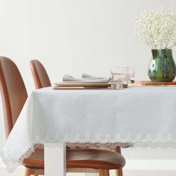 Obrus dekoracyjny z ozdobnym haftem szerokość: 145 cm, długość: 300 cm, kolor: biały, Gramatura: 200 GSM, Skład: 100% poliester