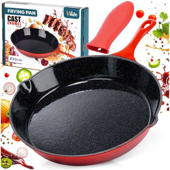 Okrągła patelnia żeliwna idealna do przygotowywania różnego rodzaju potraw. Patelnia zapewnia szybkie i jednolite smażenie. Możemy użytkować ją w każdej kuchence, ale również bezpośrednio na grillu, czy ogniu. Patelnia jest niezwykle solidna i ciężka. Żeliwo rozgrzewa się równomiernie i długo utrzymuje ciepło, dzięki czemu serwowane dania dłużej będą ciepłe. W zestawie nakładka na rączkę patelni. Sprawdzi się w domu, a także podczas biwaków, wycieczek pod namiot czy innych wyjazdów. Oryginalny produkt marki Vilde z linii Cast Enamel. Wyprodukowano zgodnie z europejskimi standardami.