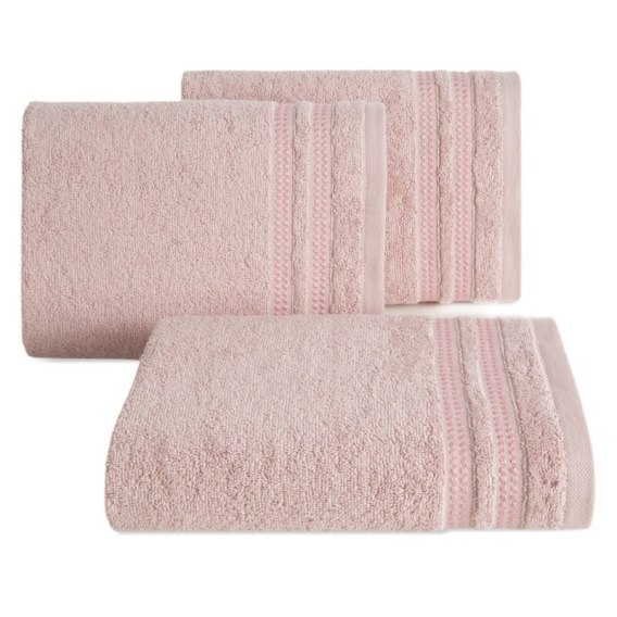 Klasyczny ręcznik kąpielowy z chłonnej tkaniny bawełnianej o splocie frotte. Minimalistyczna bordiura z weluru z dodatkiem lśniącej, metalicznej nici. szerokość: 50 cm, długość: 90 cm, kolor: pudrowy, Gramatura: 500 GSM, Skład: 100% bawełna; część ozdobna: 96% bawełna, 4% poliester