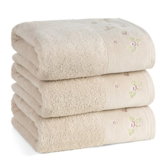 Ręcznik bawełniany z welurową bordiurą i kwiatowym haftem szerokość: 50 cm, długość: 90 cm, kolor: beżowy, Gramatura: 500 GSM, Skład: 100% bawełna