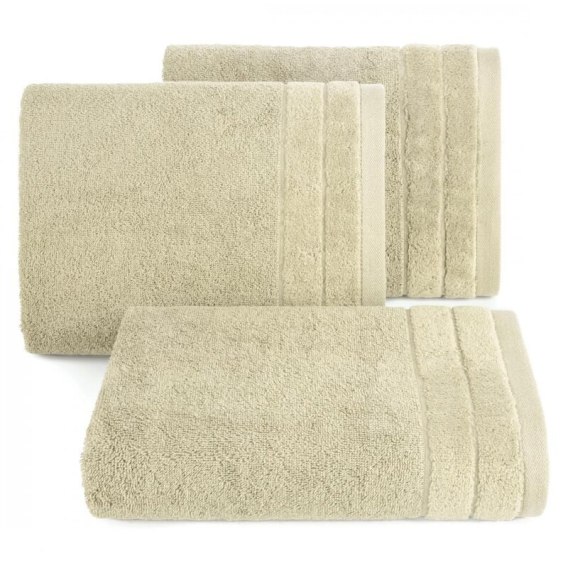 Elegancki ręcznik z delikatnej i bardzo chłonnej tkaniny frotte, jednokolorowy. Krawędzie zdobione subtelną bordiurą z welwetu. Łatwy w praniu, trwałe kolory. kolor: beżowy