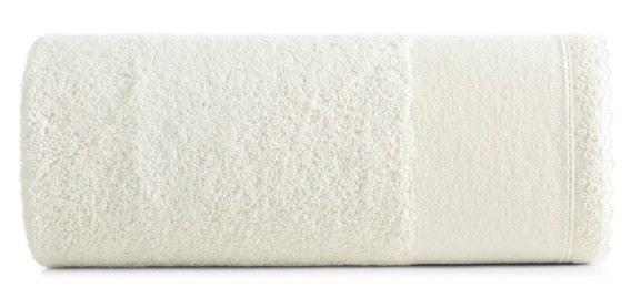Piękny ręcznik kąpielowy z miękkiej i chłonnej bawełny frotte zdobiony na bordiurze aplikacją w formie serduszek wypełnionych różyczkami. Doskonały na prezent. szerokość: 70 cm, długość: 140 cm, kolor: kremowy, Gramatura: 500 GSM, Skład: 100% bawełna; część ozdobna: 100% poliester