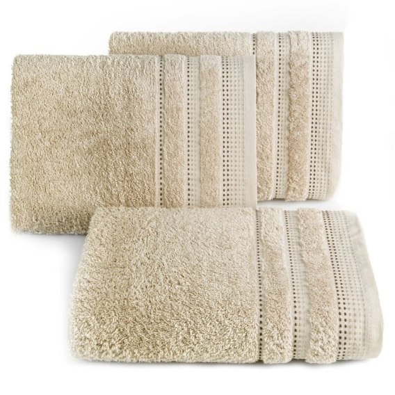 Jednobarwny ręcznik z miękkiej i chłonnej tkaniny bawełnianej o splocie frotte zdobiony kolorową bordiurą w stylu fastrygi. Łatwy w praniu, nie farbuje. szerokość: 30 cm, długość: 50 cm, kolor: beżowy, Gramatura: 500 GSM, Skład: 100% bawełna