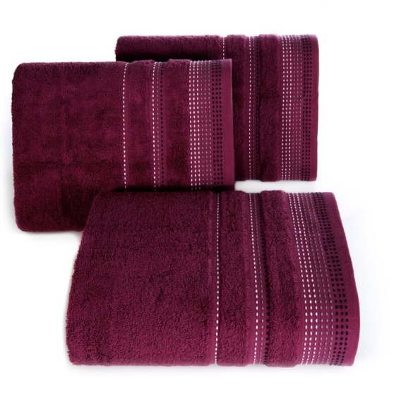 Jednobarwny ręcznik z miękkiej i chłonnej tkaniny bawełnianej o splocie frotte zdobiony kolorową bordiurą w stylu fastrygi. Łatwy w praniu, nie farbuje. szerokość: 70 cm, długość: 140 cm, kolor: fioletowy, Gramatura: 500 GSM, Skład: 100% bawełna